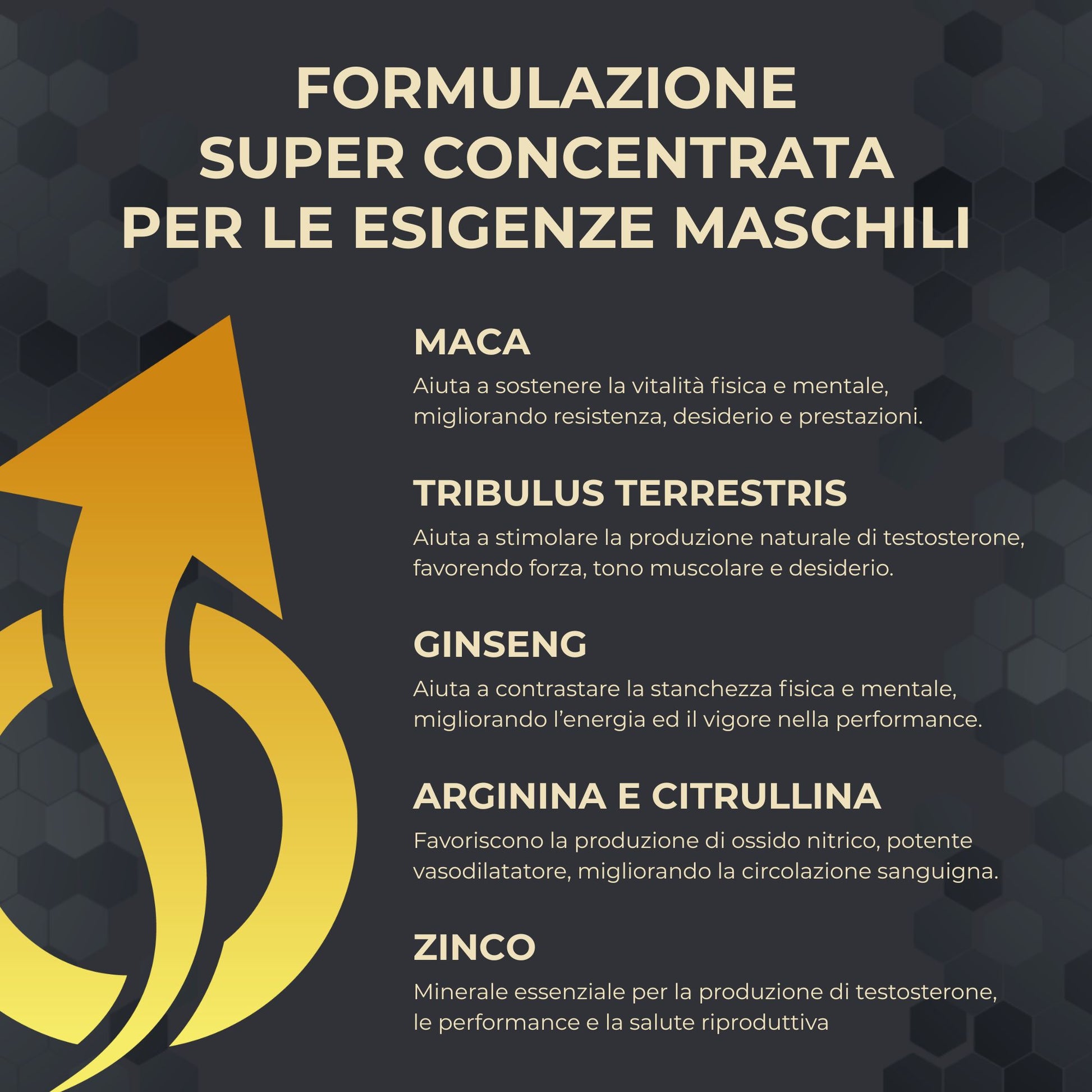 Formula extra forte con Maca Peruviana, Tribulus Terrestris, Arginina, Citrullina, Zinco e Ginseng. Migliora energia, vigore e performance, con effetto immediato e duraturo.